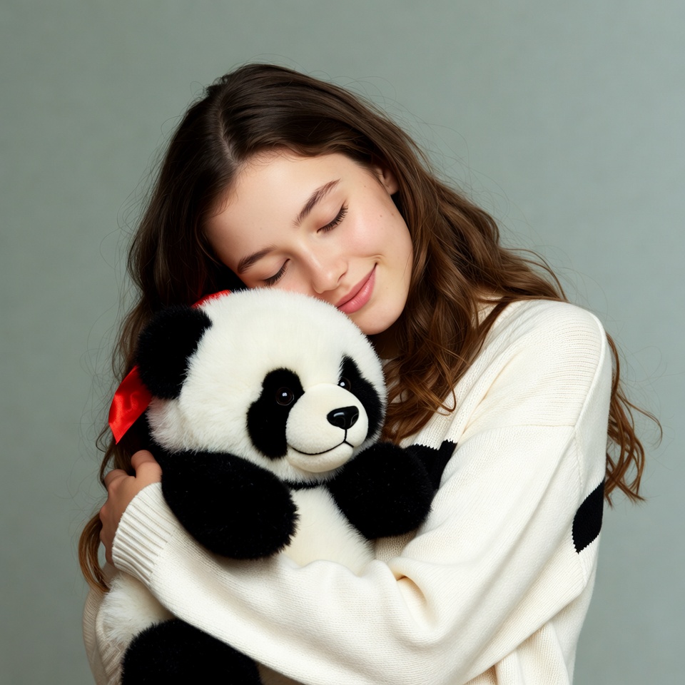 A young woman with long wavy brown hair hugs a large plush panda bear tightly. She wears a white sweater and smiles gently with closed eyes. The image features a plain light gray background.