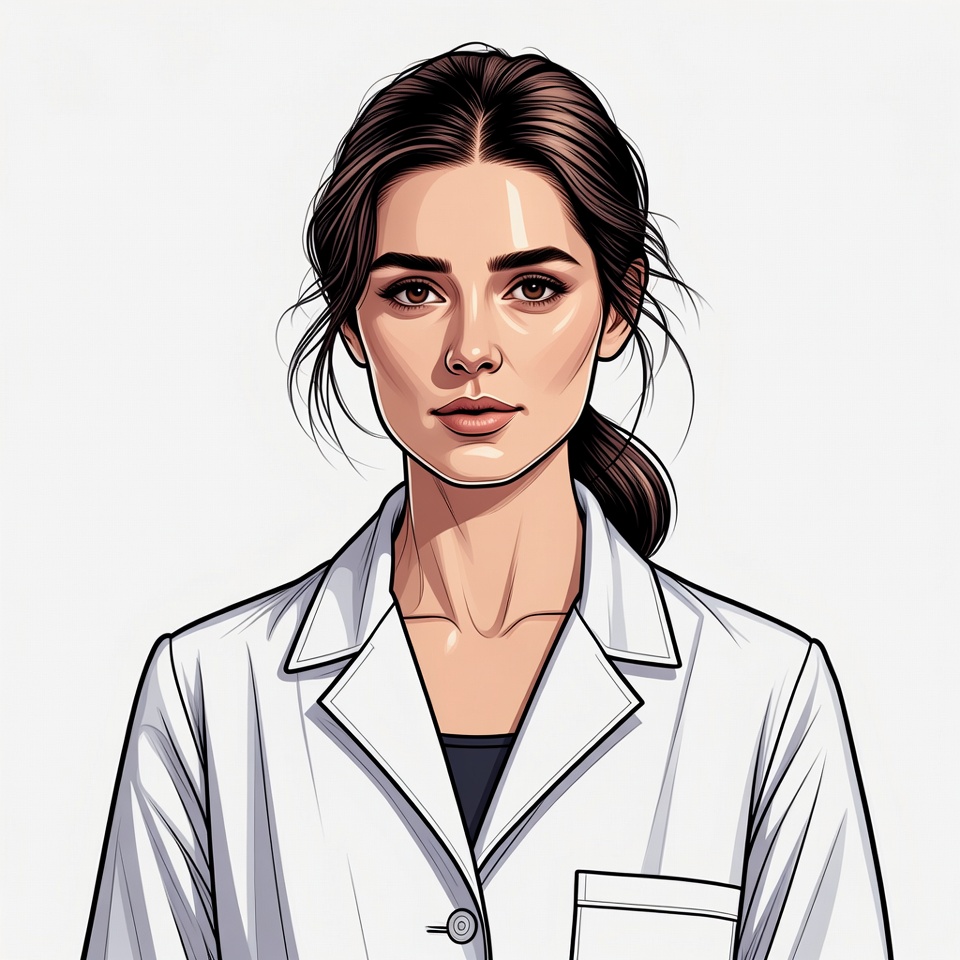 A young woman with brown hair styled in a loose ponytail wears a white lab coat over a dark top. She faces forward with a neutral expression against an isolated white background. The image is a detailed digital illustration.