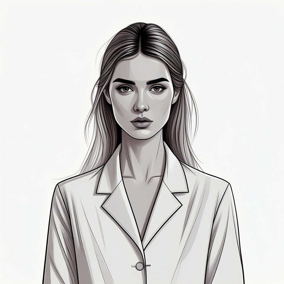 A digital illustration of a young woman with long wavy hair faces forward against a white background. She wears a white blazer with a notched lapel and subtle buttons. Her expression is neutral with direct gaze.