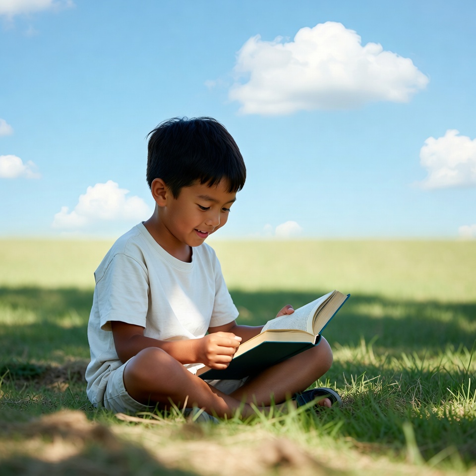 A young Asian boy with short black hair sits cross-legged on green grass, reading an open book. He wears a white short-sleeved shirt and shorts, smiling happily under a bright blue sky with white clouds. Gentle shadows fall on the lush field around him.