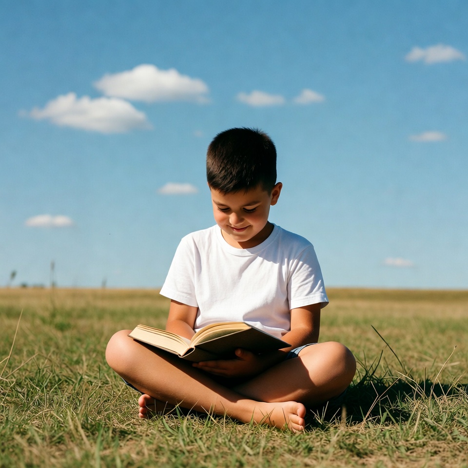 A young boy with short dark hair sits cross-legged on green grass in an open field, reading an open book. He wears a white short-sleeved t-shirt and shorts, smiling happily. A clear blue sky with scattered white clouds forms the background.