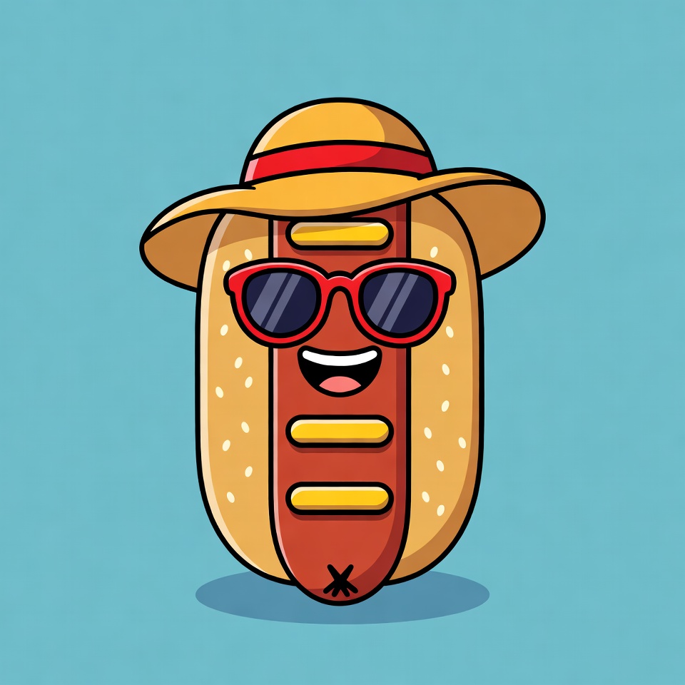 A cartoon hot dog with a bun stands on a blue background. It wears red-trimmed yellow sun hat and red sunglasses. The hot dog has a big smiling mouth and a small mustache.