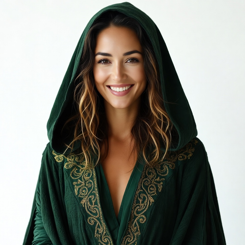 A woman with wavy brown hair smiles warmly while wearing a green hooded robe with gold embroidery. The robe features a deep hood framing her face and a low neckline. She stands against a plain white background.