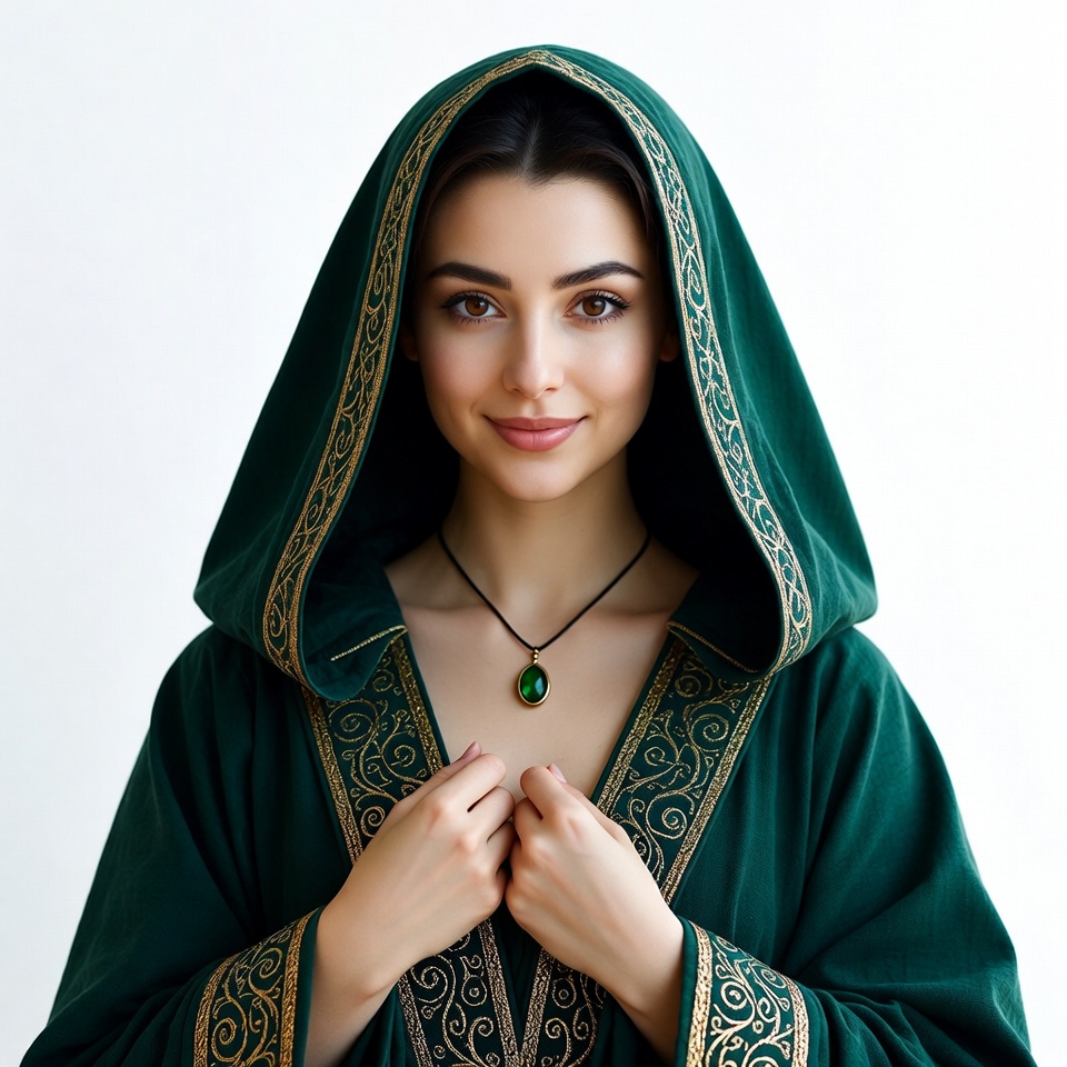 Middle Eastern, beautiful woman, dark hair, fantasy clothing, gemstone pendant, gold embroidery, green hood, green necklace, hands clasped, hooded robe, isolated background, ornate robe, smiling woman, young woman, woman