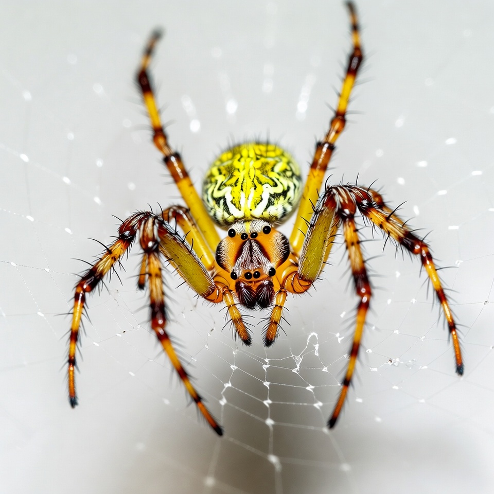 A vibrant golden orb-weaver spider with yellow and black patterned abdomen sits prominently in the center of its white web. Its long orange legs with black hairs extend outward, and its cephalothorax features distinctive black markings. The spider faces forward against an isolated white background.