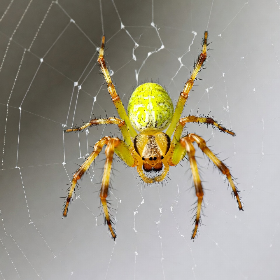 arachnid, eight legs, gray web, green spider, insect, legs spread, macro, nature, orange legs, orb-weaver, speckled abdomen, spider web, web strands, wildlife, spider