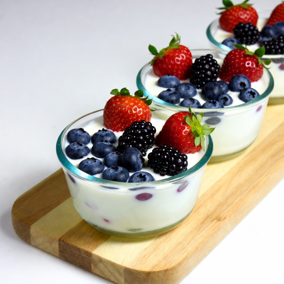 Three glass bowls of creamy white yogurt topped with fresh strawberries, blueberries, and blackberries sit on a wooden board. The berries are vibrant red, blue, and black, arranged attractively on the yogurt. The setup is isolated against a white background.