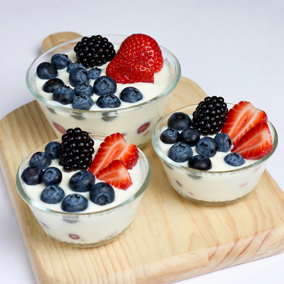 Three glass bowls of creamy yogurt topped with blueberries, blackberries, and strawberries sit on a wooden board. The vibrant red strawberries and purple berries contrast against the white yogurt. The setup is arranged neatly on a plain white background.
