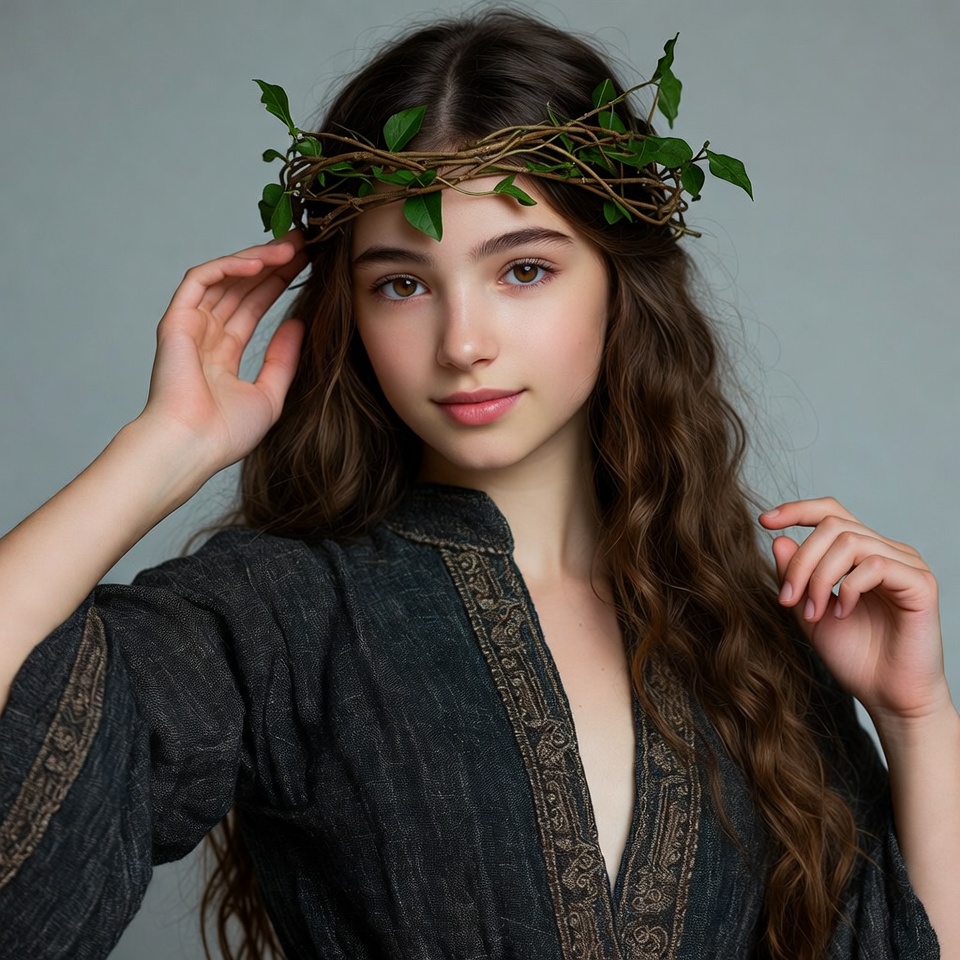 A young girl with long wavy brown hair wears a crown made of green ivy leaves and branches on her head. She has her hands gently touching her face and wears a dark embroidered loose-fitting dress with a V-neckline. She stands against a plain light gray background.