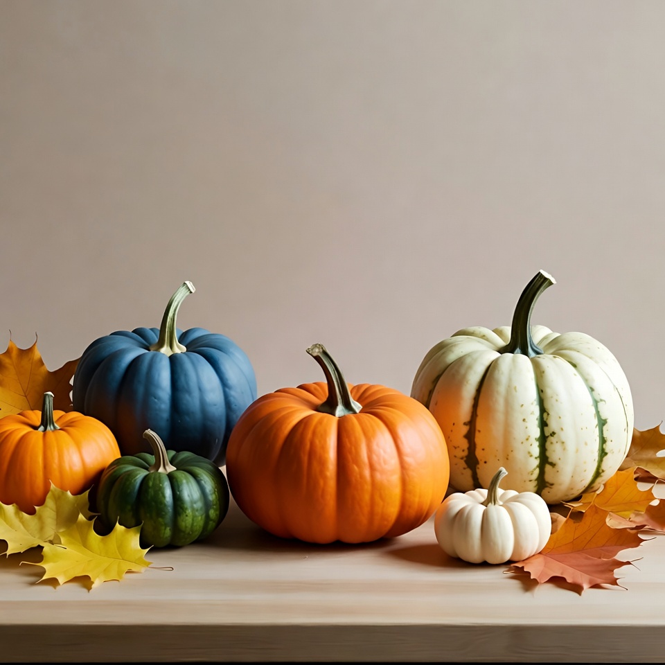 A variety of colorful pumpkins in orange, blue, green, and white are arranged on a wooden surface. Scattered yellow and orange autumn leaves surround the pumpkins. The neutral beige background highlights the vibrant colors and textures.
