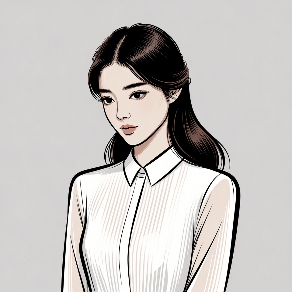 An illustration of a young Asian woman with long dark hair styled with a side part. She wears a sheer white collared blouse with long sleeves and a subtle outline design. The portrait is set against a plain gray background.