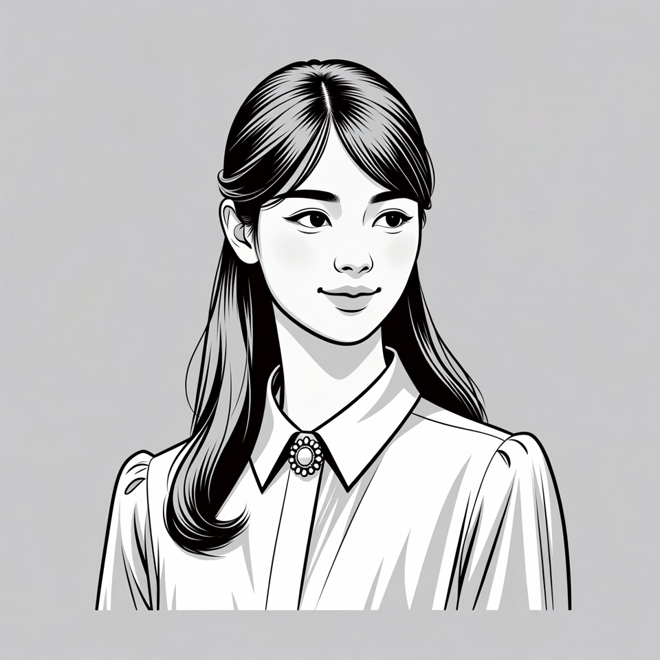 A black and white line art illustration depicts a young Asian woman with long dark hair parted in the middle and falling over her shoulders. She wears a collared blouse with puffed sleeves and a decorative brooch at the neck, smiling gently with a direct gaze. The figure is centered on a plain gray background.