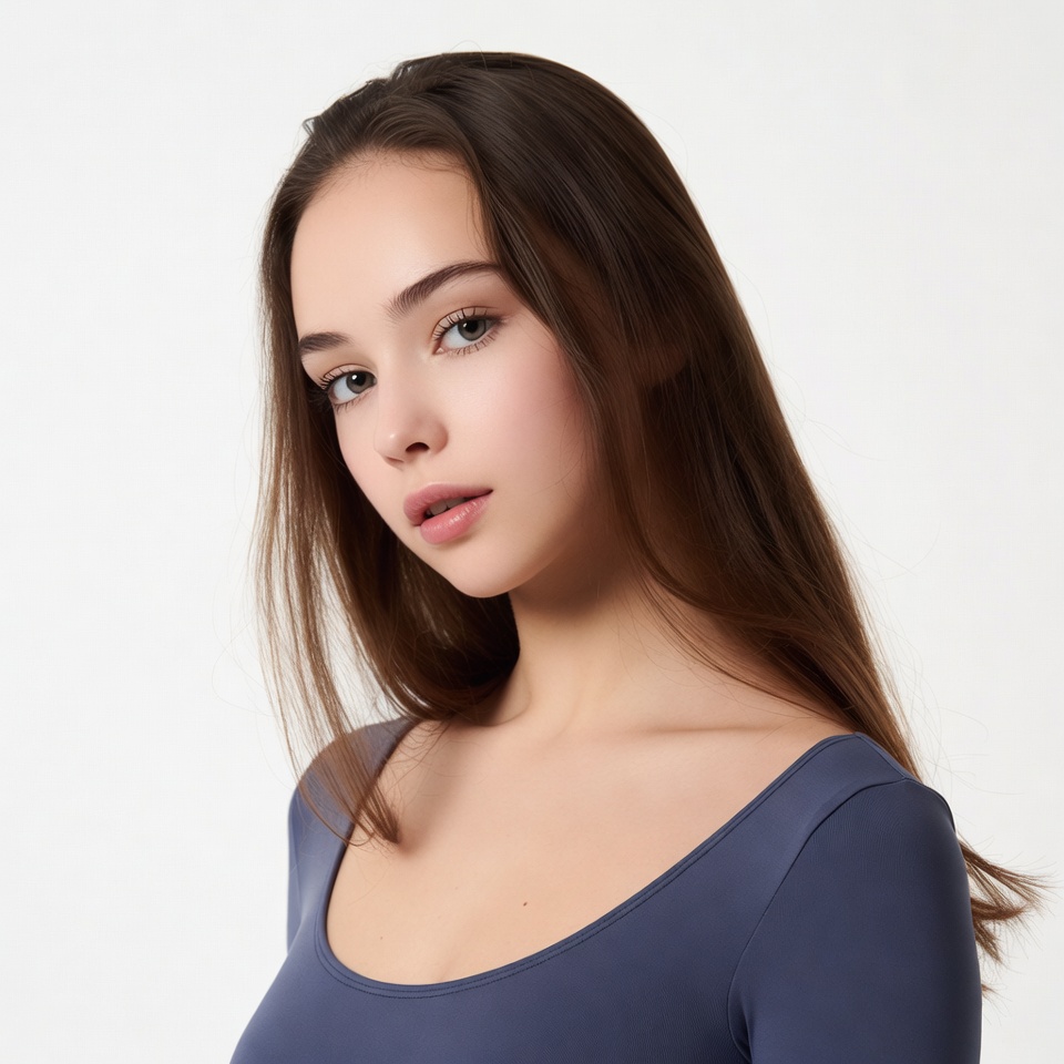 A young woman with long straight brown hair faces slightly to the side against a white background. She wears a navy blue scoop-neck top that reveals her shoulders. Her expression is neutral with subtle makeup on her face.