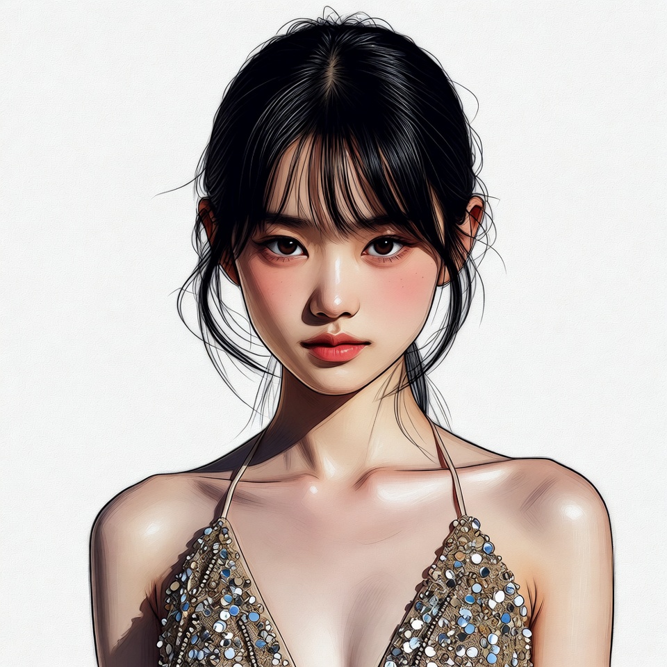 anime style, bangs, beautiful face, bikini top, black hair, closeup, detailed eyes, digital art, elegant portrait, female, glossy lips, illustration, kawaii girl, pink blush, portrait, red lips, sequin top, shiny bikini, silver sequins, smooth skin, soft expression, thin straps, white background, woman, young woman, Asian woman