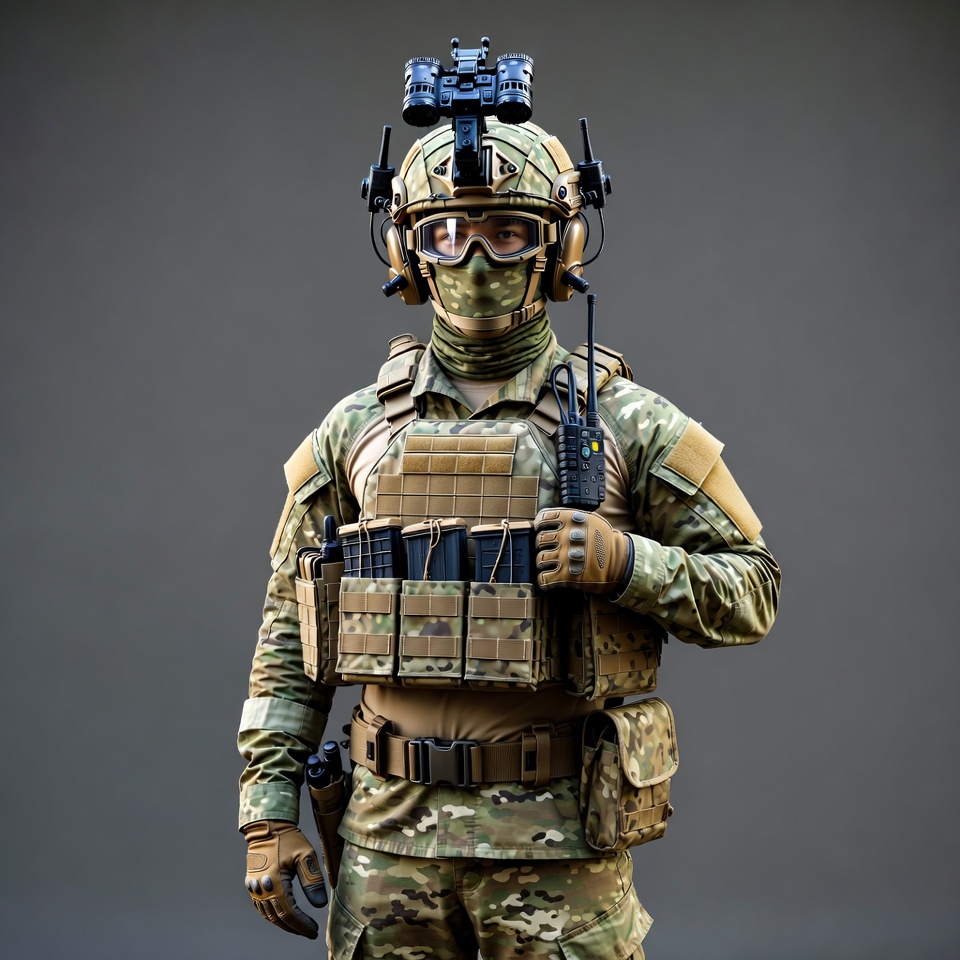 A soldier stands in full tactical gear on a gray background. He wears a helmet with night vision goggles, a balaclava, multicam uniform, plate carrier with magazines, gloves, and holds a radio. His outfit includes multiple pouches and straps for combat readiness.