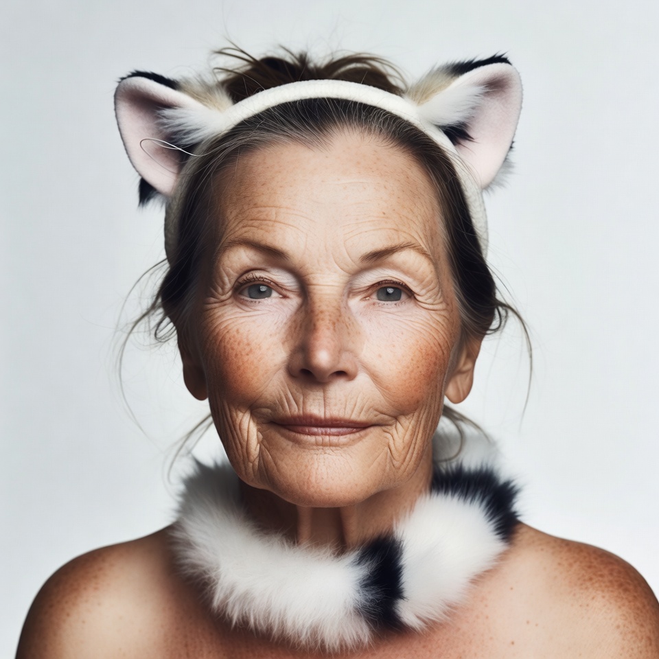 An elderly White woman with messy hair and freckled skin faces the camera against a white background. She wears a white headband with black and white cat ears and a matching fluffy cat collar necklace. Her shoulders are bare, revealing freckled skin.