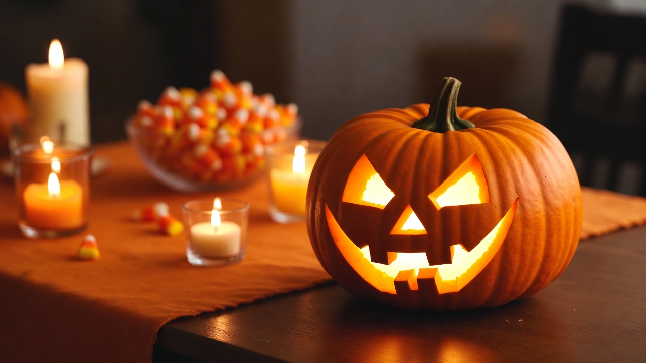 A carved jack-o-lantern with glowing eyes, nose, and jagged smile sits on a wooden table covered by an orange cloth. Surrounding it are white pillar candles flickering in glass holders and a bowl overflowing with candy corn. Scattered candies add to the Halloween table setup.