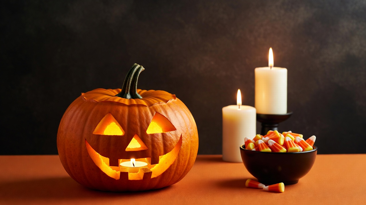 Lit Jack-o-Lantern with Candies and Candles