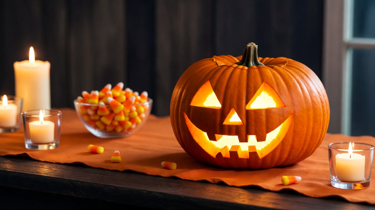 A carved jack-o-lantern pumpkin with glowing eyes, nose, and jagged smile sits on a wooden table covered with an orange cloth. Surrounding it are several white pillar candles and a glass bowl overflowing with candy corn. Scattered candy corn pieces add to the Halloween display against a dark background.