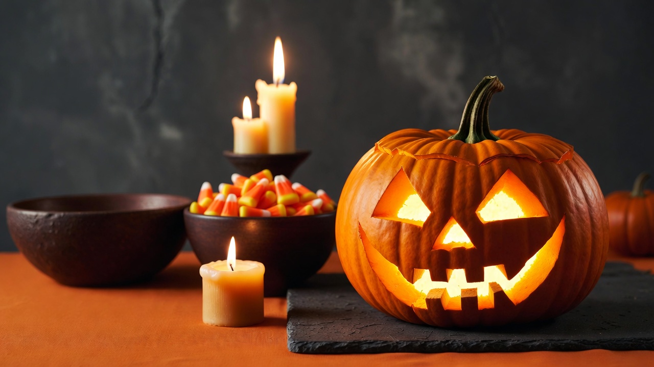 A carved jack-o-lantern pumpkin with glowing eyes, nose, and mouth sits on a dark slate surface. Surrounding it are bowls of orange candy corn, flickering candles, and small pumpkins on a rustic orange table. The dark textured background enhances the Halloween theme.