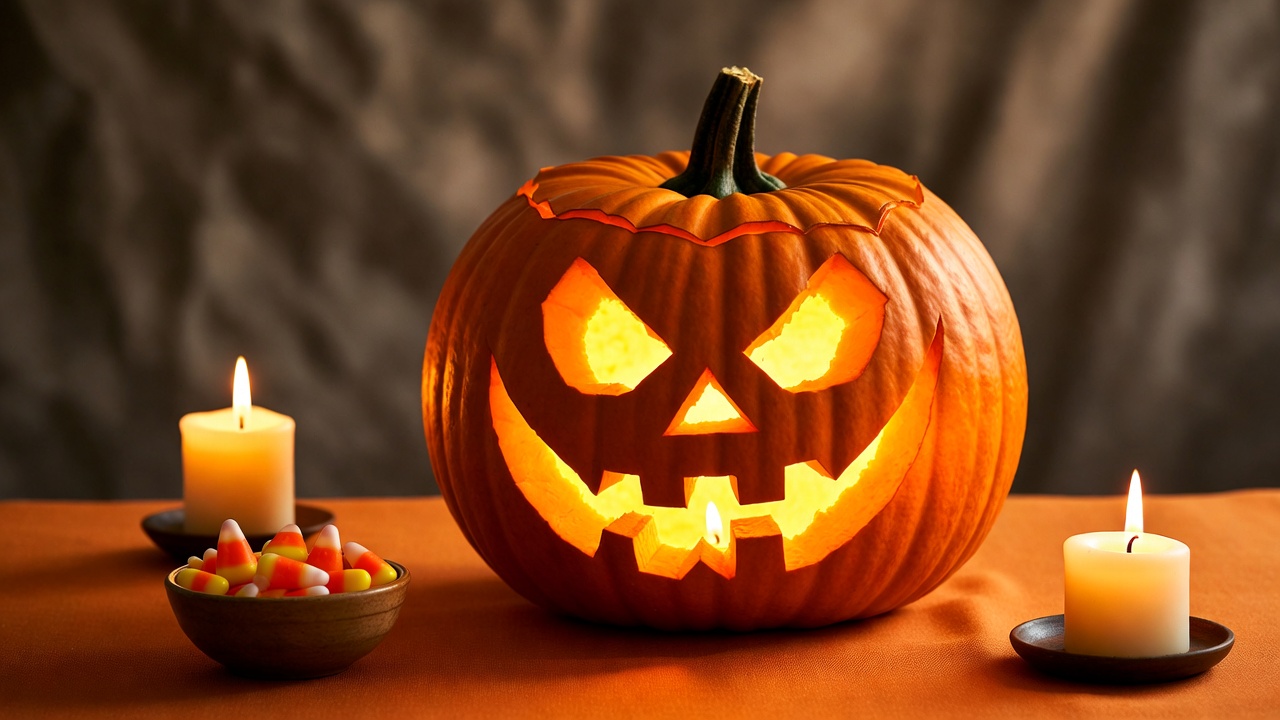 A carved pumpkin with a scary face glows brightly from an internal light on a wooden table. Surrounding it are two flickering candles in small holders and a bowl filled with orange candy corn. The setup features a dark blurred background for a Halloween atmosphere.