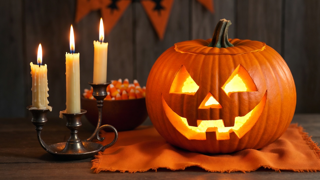A carved jack-o-lantern pumpkin with glowing triangular eyes, nose, and jagged smile sits on a wooden table covered by an orange cloth. A silver candelabra holding five lit white candles stands beside it, with a bowl of candy corn nearby. Orange Halloween bats and banners hang in the dark background.
