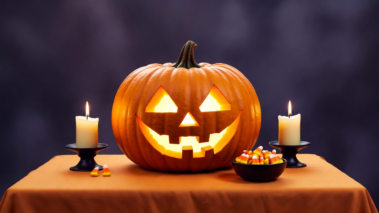 A carved jack-o-lantern pumpkin with a grinning face glows brightly on an orange table. Two lit candles in black holders flank it, and small bowls of candy corn sit nearby. The setup is against a dark purple background.