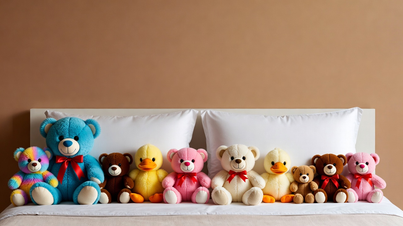 Colorful teddy bears on bed