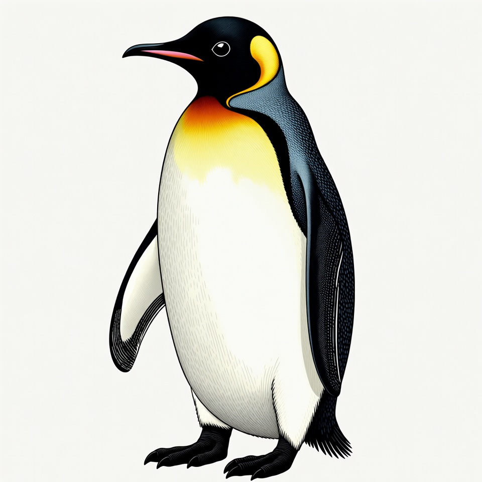 A detailed illustration of an emperor penguin stands on a white isolated background. The penguin features black and white feathers, a yellow crown on its head and neck, and a red beak. Its wings are slightly spread, showcasing its plump body and black feet.