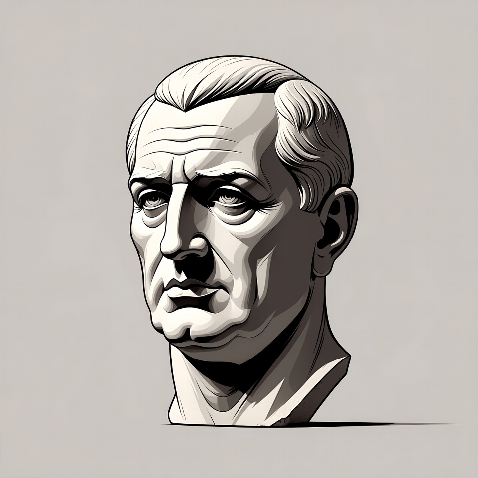Roman emperor, White, ancient Rome, bust, classical art, digital art, grayscale, historical figure, illustration, isolated background, male portrait, man, portrait, profile view, sculpture style, shaded drawing, short hair, stern face, white hair, Julius Caesar