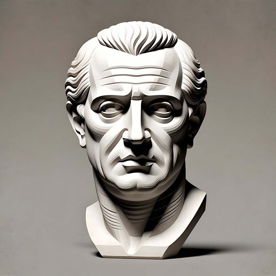 3D render, Roman emperor, Roman man, White man, ancient Rome, art, bust statue, classical statue, detailed carving, head sculpture, historical figure, isolated background, male portrait, neutral background, portrait bust, sculpture, stern face, wavy hair, white marble, marble bust