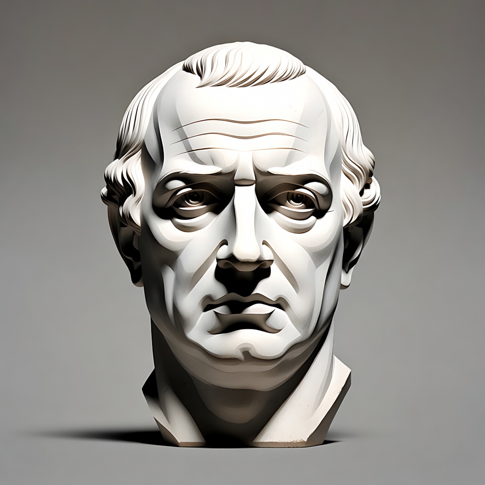 White, ancient style, bust sculpture, classical sculpture, detailed face, elderly man, gray background, isolated background, male portrait, man, neoclassical art, portrait bust, sculpture, serious expression, statue, white hair, marble bust