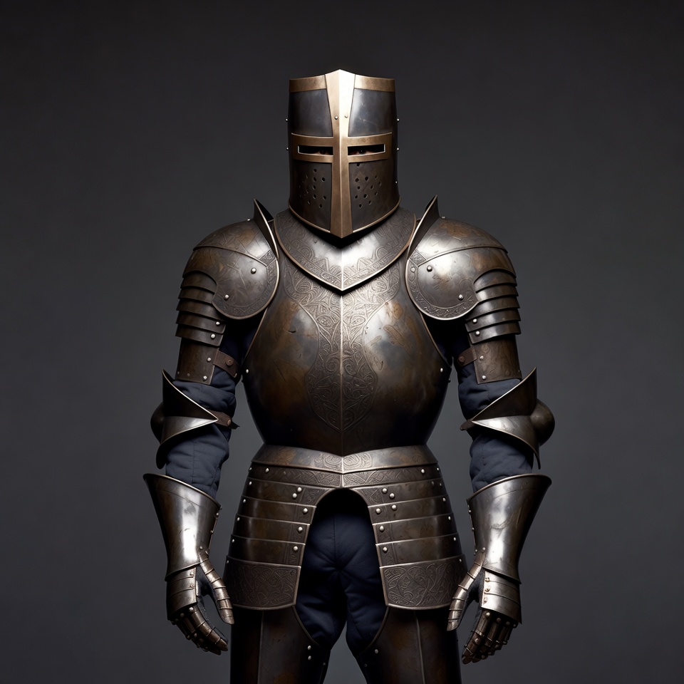 A knight stands in full medieval armor with a cross-emblazoned helmet on a dark background. The armor features ornate gold-trimmed plates, gauntlets, and pauldrons. He wears dark fabric underneath the metallic suit.