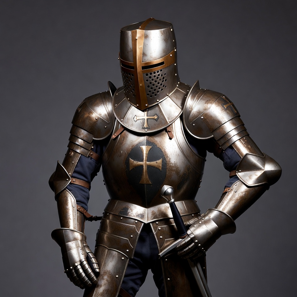 White, armor, black cross, crusader, dark background, full armor, gauntlets, gold accents, helmet, historical, isolated background, male, medieval knight, metal armor, posed, silver armor, standing, sword, visored helmet, warrior, knight