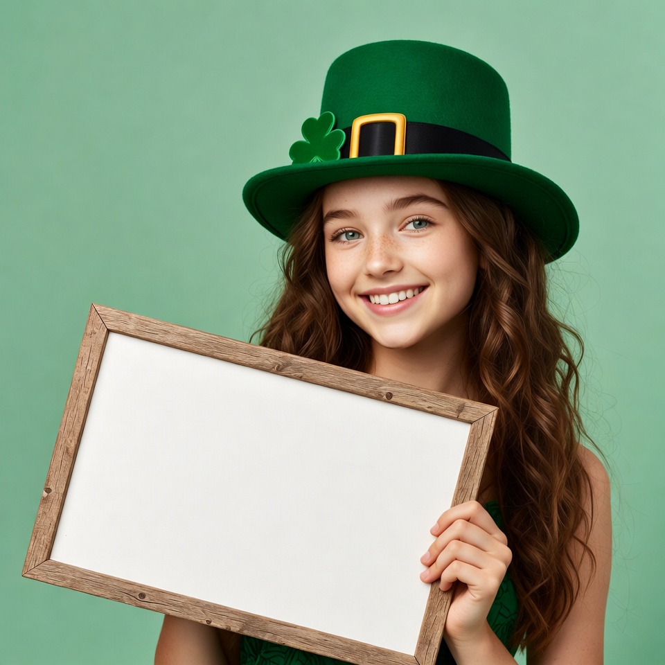A young girl with long curly brown hair smiles while holding a wooden-framed blank sign. She wears a green leprechaun top hat adorned with a gold buckle and shamrock. The image features a bright green background perfect for St. Patrick's Day.