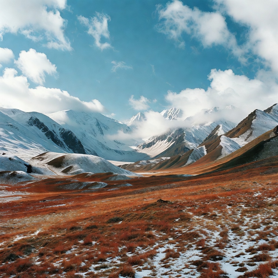 Majestic snow-capped mountains rise dramatically above a vast valley with reddish-brown grass and patches of snow. Fluffy white clouds partially obscure the rugged peaks under a bright blue sky. The foreground features rolling hills with autumn-colored tundra.
