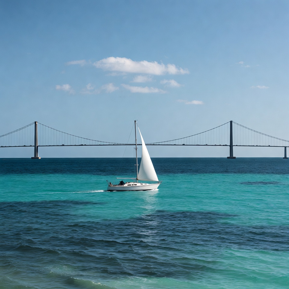 A white sailboat with two people on board sails through turquoise ocean waters under a large suspension bridge. The bridge spans the sea with clear blue skies and scattered clouds above. Gentle waves reflect the boat and bridge in the vibrant water.
