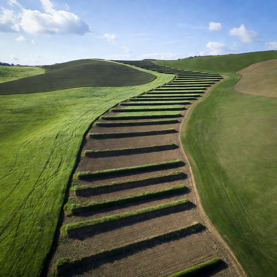 Aerial view of a long staircase made entirely of vibrant green grass winding up terraced hills. The steps are neatly cut into the landscape, surrounded by patches of darker soil and lush green fields. Fluffy white clouds dot the clear blue sky above.