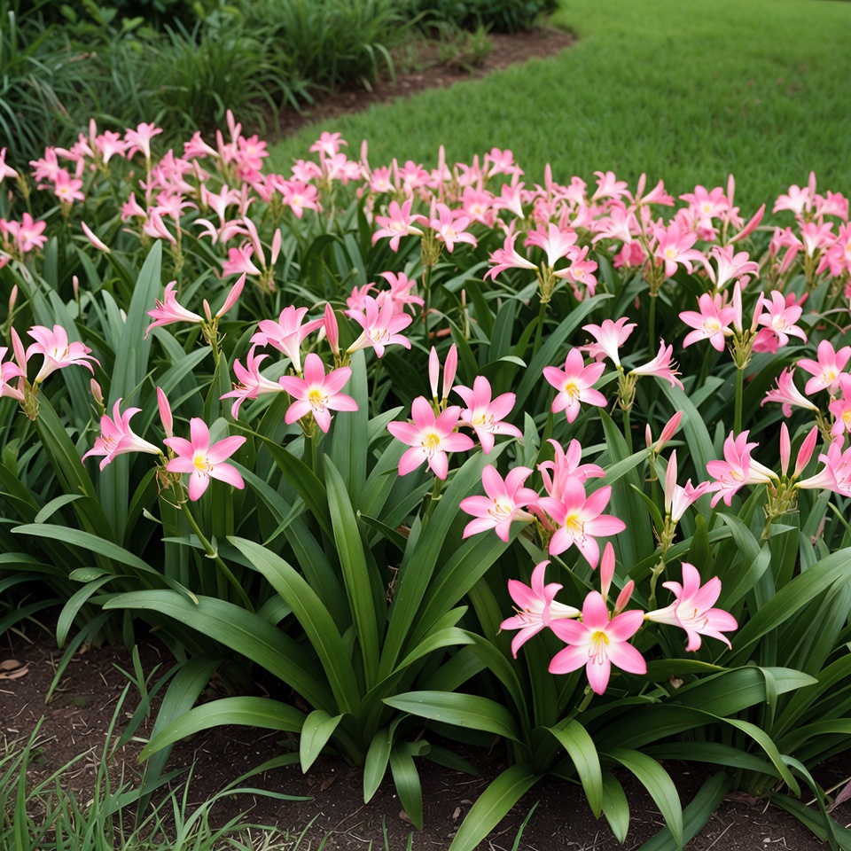 A dense cluster of vibrant pink lily flowers blooms in a lush green garden. The lilies feature long green leaves and striking pink petals with white centers. They grow along a curved garden path surrounded by grass and foliage.