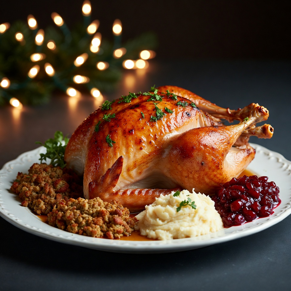 A whole roasted turkey with glossy glaze and fresh herbs sits centered on a white plate. The plate is garnished with mashed potatoes, cranberry sauce, and stuffing. Twinkling Christmas lights and green branches provide a festive holiday backdrop.