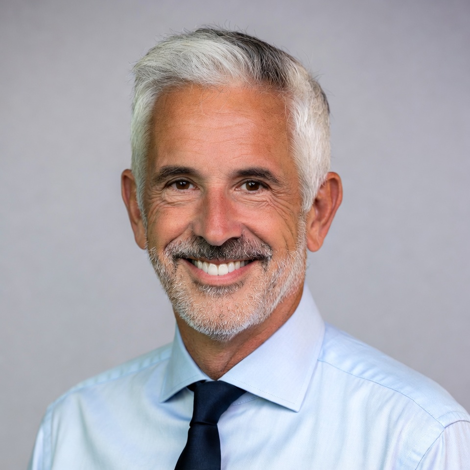 A mature man with short gray hair and a mustache smiles at the camera. He wears a light blue dress shirt and dark tie. The portrait is set against a plain gray background.