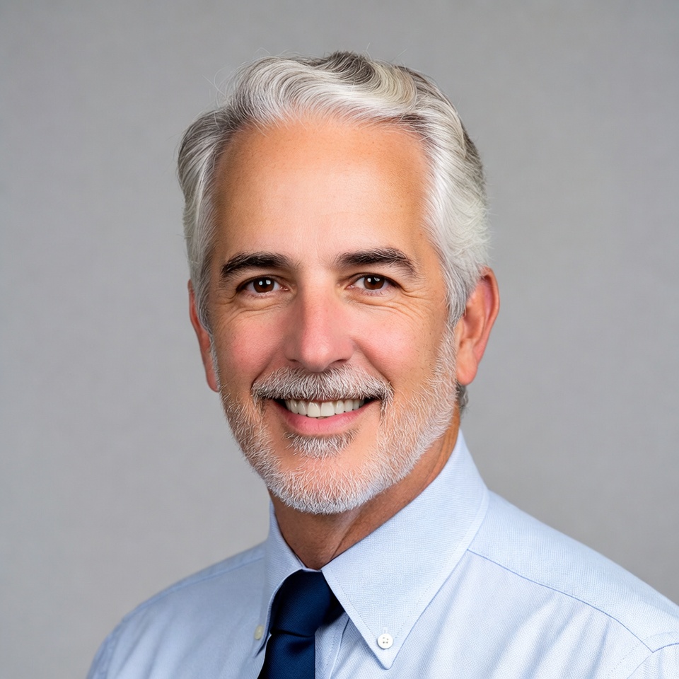 A mature man with silver hair and a neatly trimmed beard smiles warmly at the camera. He wears a light blue dress shirt, dark tie, and has a professional appearance. The image is a close-up headshot against a plain gray background.