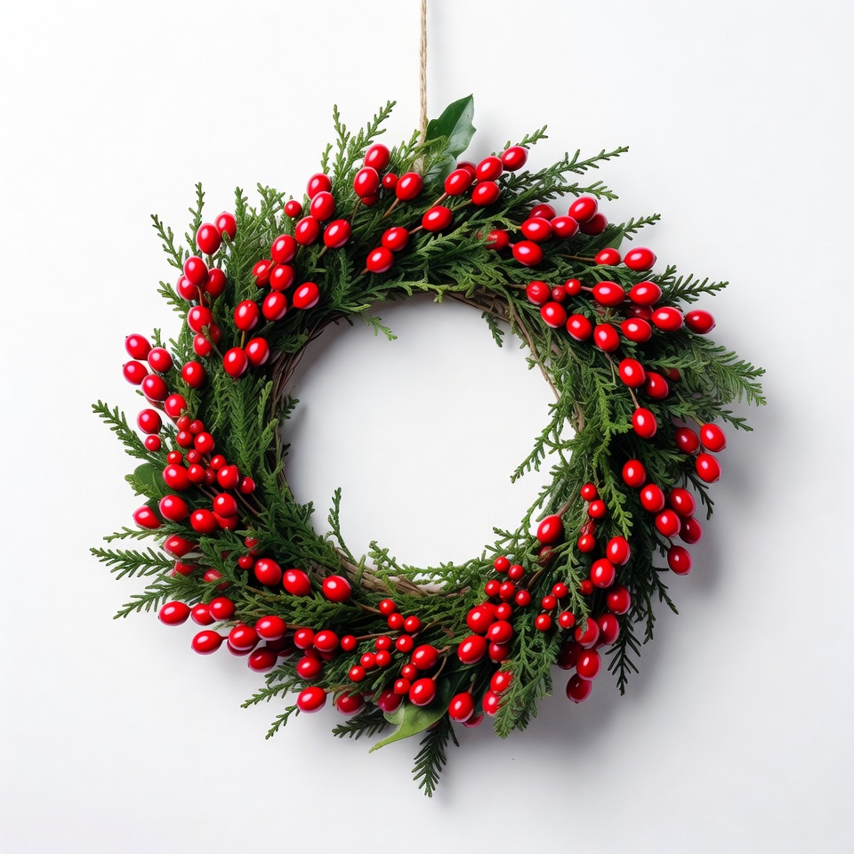 A festive Christmas wreath hangs from a rope against a white background. It features lush green cedar branches adorned with clusters of bright red berries and green leaves. The wreath has a circular shape with an open center.