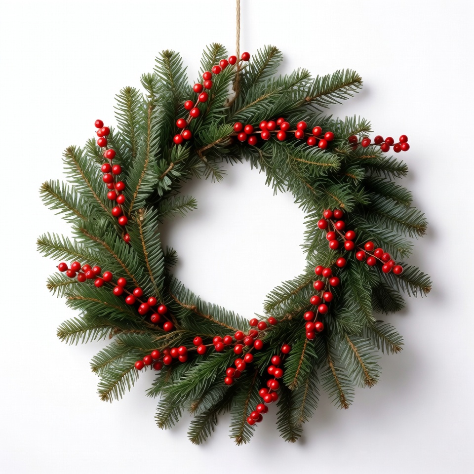Christmas decoration, Christmas ornament, berries, circular wreath, evergreen wreath, festive wreath, fir branches, green pine, hanging wreath, holiday decor, holly berries, isolated wreath, pine needles, red and green, red berries, seasonal decor, traditional wreath, white background, winter wreath, wreath, Christmas wreath