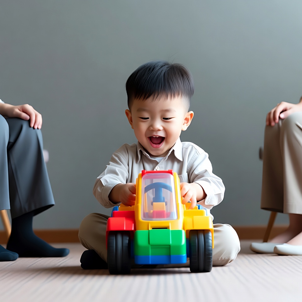 A young Asian boy with black hair sits on the floor, happily playing with a colorful plastic toy car. He wears a light shirt and pants while grinning widely. Two Asian women in formal attire sit on chairs nearby, watching him on a light wooden floor against a gray background.