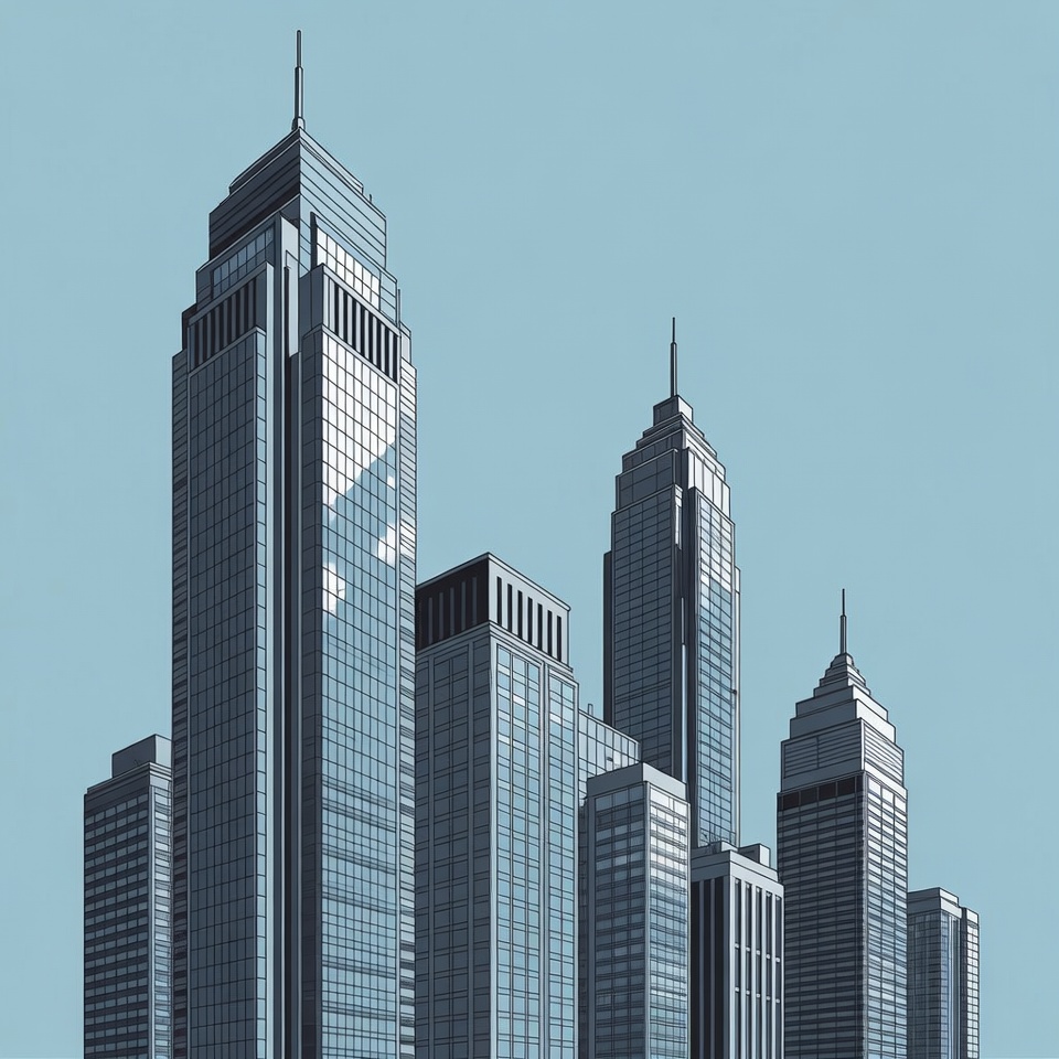 A collection of tall modern skyscrapers with glass facades stands against a light blue sky. The buildings feature sleek architectural designs with spires and reflective surfaces. The image is rendered in a clean line art illustration style.