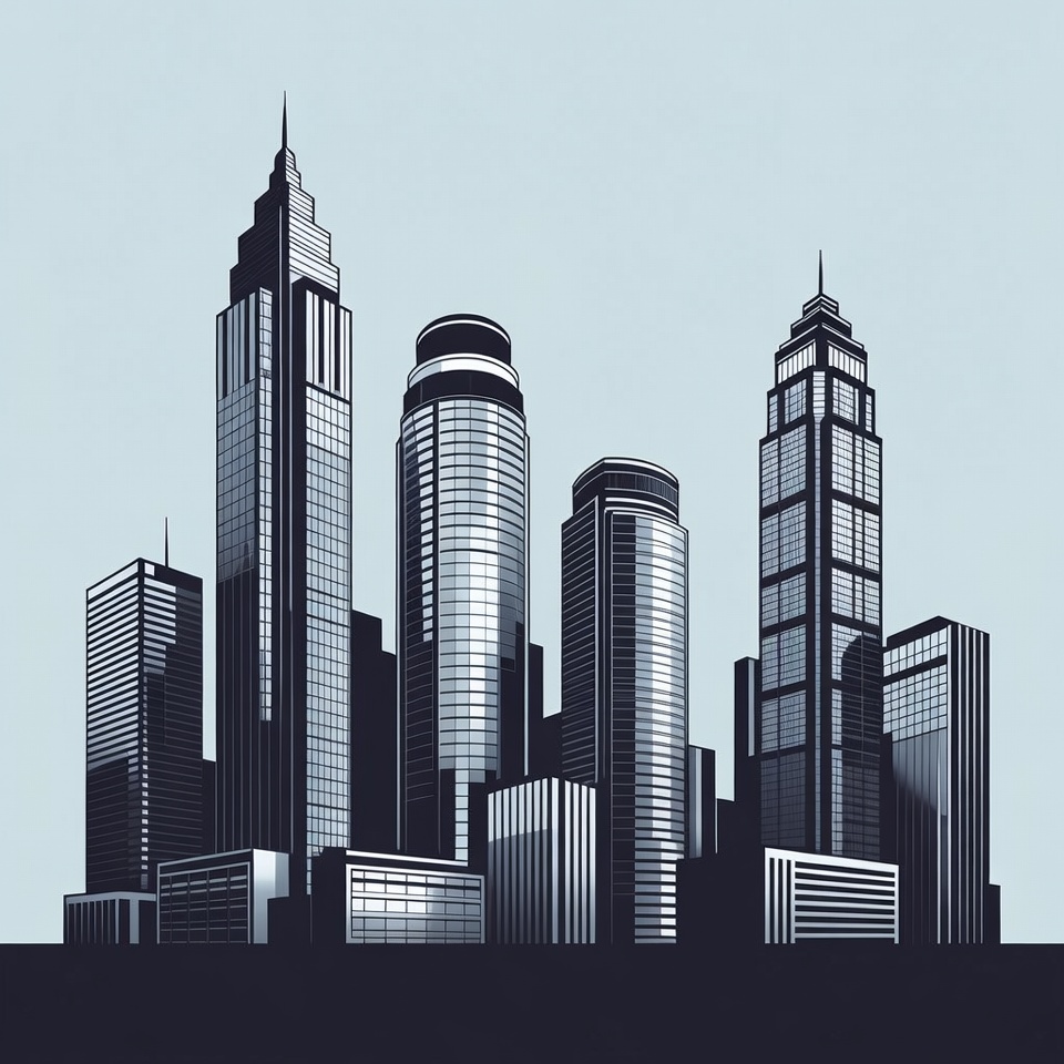 A minimalist vector illustration depicts a cluster of tall modern skyscrapers forming a city skyline. The buildings feature sleek glass facades and varied architectural designs in black and white tones. They stand against a light blue gradient background.