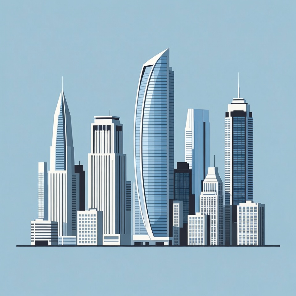 A flat vector illustration depicts a modern city skyline with numerous tall skyscrapers on a light blue background. The buildings feature sleek designs including curved glass towers, pointed spires, and rectangular high-rises in white and blue tones. The composition is isolated against a solid gradient sky.