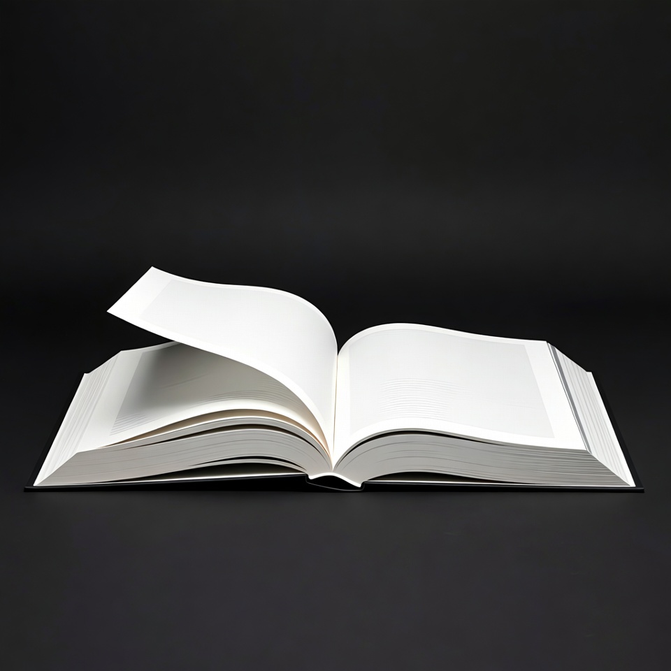 A white hardcover book lies open on a solid black background. The pages are blank and spread wide, with one side slightly lifted. The book is centered and isolated against the dark surface.
