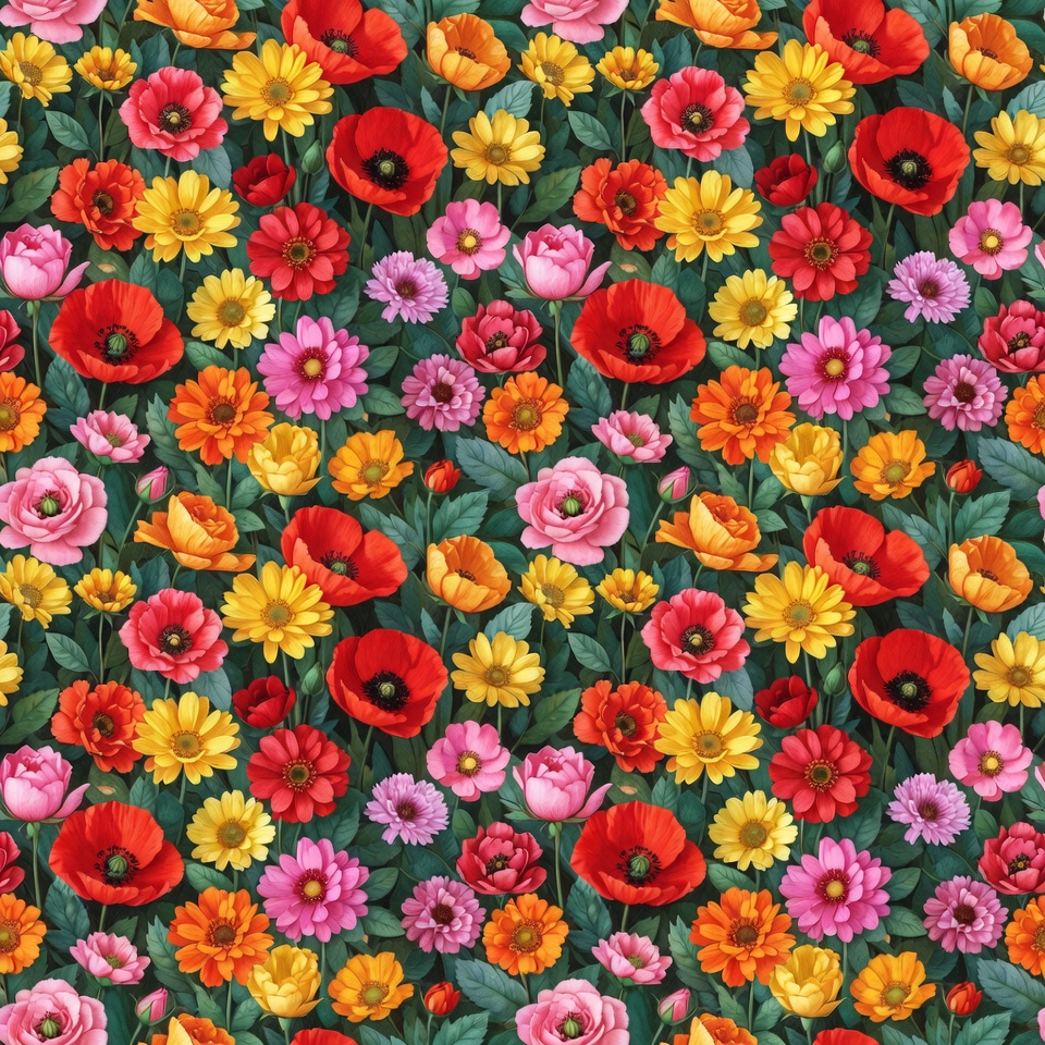A vibrant seamless pattern features an abundance of poppy flowers in red, yellow, pink, and orange hues. The flowers bloom amidst green leaves on a repeating background design. The illustration showcases detailed petals and stems in a lively floral arrangement.